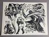 The original sheets of these Grim Reapers hang on the walls at Resurrected Tattoo and were done in marker and color pencil on textured paper. Prints of these sheets were found in a box in the basement of the tattoo shop. The prints are all on lightly toned watercolor paper, and may be slightly larger than 11x14, but can all be trimmed to fit a standard 11x14 frame.
